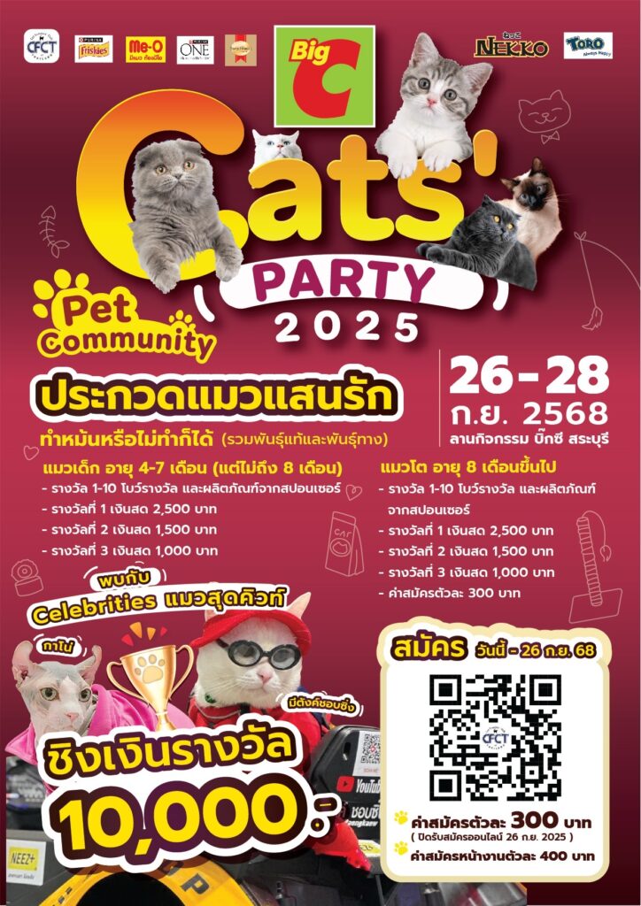 บิ๊กซี ซูเปอร์เซ็นเตอร์ ร่วมกับพันธมิตรกว่า 6 แบรนด์ชั้นนำ ได้แก่ Friskies, Me-O, Me-O Gold, Toro Toro, Nekko, Purina One และ SmartHeart จัดงาน “CATS’ PARTY 2025” กิจกรรมสุดพิเศษเพื่อคนรักแมว ระหว่างวันที่ 26 – 28 กันยายน 2568 ณ โซนพลาซ่า บิ๊กซี เพลส สาขาสระบุรี