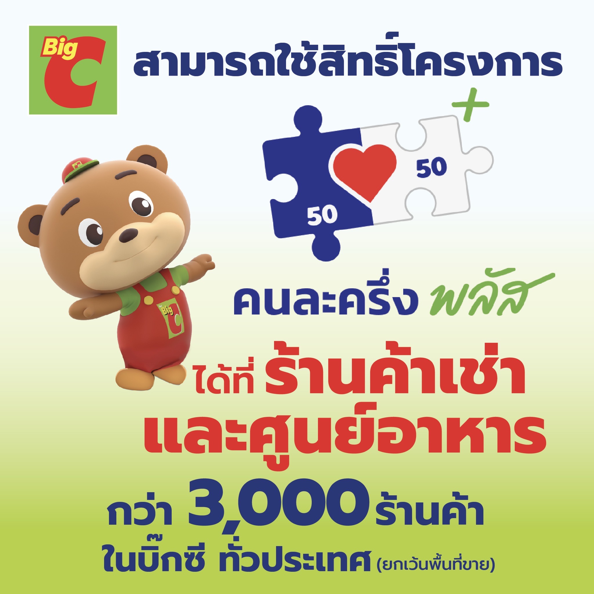 บิ๊กซี ซูเปอร์เซ็นเตอร์ ร่วมอยู่เคียงข้างคนไทย ขอเชิญชวนทุกคนมาใช้สิทธิ์ “คนละครึ่ง พลัส” ได้ทุกวันที่ร้านค้าในโซนพลาซ่า และ ศูนย์อาหารบิ๊กซี อิ่ม อร่อย คุ้มค่า กว่า 3,000 ร้านค้า เพียงแค่สังเกตสัญลักษณ์ หรือ โลโก้ “คนละครึ่งพลัส” ติดไว้ที่หน้าร้าน และชำระง่ายๆ ผ่านแอป “เป๋าตัง” เท่านั้นท่านก็จะได้เป็นส่วนหนึ่งที่ช่วยสนับสนุนผู้ประกอบการคนไทยให้เติบโตไปด้วยกัน ตั้งแต่วันนี้ถึงวันที่ 31 ธันวาคม 68 ที่ บิ๊กซี ทั่วประเทศ