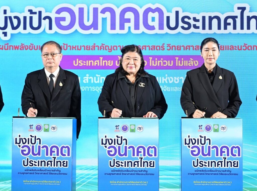 ดร.วิภารัตน์ ดีอ่อง ผู้อำนวยการสำนักงานการวิจัยแห่งชาติ กล่าวว่า วช. ภายใต้กระทรวง อว. เป็นหน่วยบริหารจัดการทุนวิจัยและนวัตกรรม ร่วมกับสำนักงานพัฒนาการวิจัยการเกษตร (องค์การมหาชน) ซึ่งเป็นหน่วยบริหารจัดการทุนด้านการเกษตร สังกัดกระทรวงเกษตรและสหกรณ์ ได้รับมอบหมายจากคณะกรรมการส่งเสริมวิทยาศาสตร์ วิจัยและนวัตกรรม (กสว.) ให้ขับเคลื่อนเป้าหมายสำคัญตามยุทธศาสตร์ ววน. ในประเด็น “น้ำมั่นคง ไม่ท่วม ไม่แล้ง ใน 10 จังหวัด” โดยนำองค์ความรู้ เทคโนโลยี และนวัตกรรมไปบูรณาการร่วมกับกลไกในพื้นที่ เพื่อให้บรรลุเป้าหมายเชิงกลยุทธ์ ได้แก่ 1. น้ำไม่ท่วม ไม่แล้ง (100 ตำบล ใน 10 จังหวัด) 2. ลดความเดือดร้อนด้านน้ำท่วม–น้ำแล้ง 120,000 ครัวเรือน 3. เพิ่มรายได้/ลดค่าใช้จ่ายจากภาครัฐ 900 ล้านบาทจังหวัดขอนแก่นเป็นหนึ่งในพื้นที่เป้าหมายสำคัญในการบริหารจัดการน้ำเพื่อความมั่นคง โดย วช. ได้ร่วมดำเนินงานกับภาคีหน่วยงานต่าง ๆ และพร้อมรับฟังความคิดเห็น เพื่อร่วมกันหาแนวทางยกระดับการแก้ไขปัญหาน้ำของจังหวัดขอนแก่นและจังหวัดชัยภูมิ ไม่ว่าจะเป็นด้านการประกันน้ำให้เพียงพอ การแก้ปัญหาภัยแล้งให้เกษตรกรพึ่งพาตนเองได้อย่างยั่งยืน การลดความเสี่ยงน้ำท่วม และการพัฒนาระบบเตือนภัย เพื่อให้ชุมชนมีความปลอดภัยมากขึ้น วช. รู้สึกเป็นเกียรติอย่างยิ่งที่ได้ร่วมลงนามบันทึกข้อตกลงความร่วมมือกับทุกหน่วยงานภาคีเครือข่ายที่มีเจตนารมณ์ร่วมกัน ร่วมเป็นส่วนหนึ่งในการแก้ปัญหาด้านน้ำของประเทศ อันเป็นจุดเริ่มต้นสำคัญในการ “มุ่งเป้าอนาคตประเทศไทยเพื่อน้ำมั่นคง ไม่ท่วม ไม่แล้ง ด้วยวิจัยและนวัตกรรม”