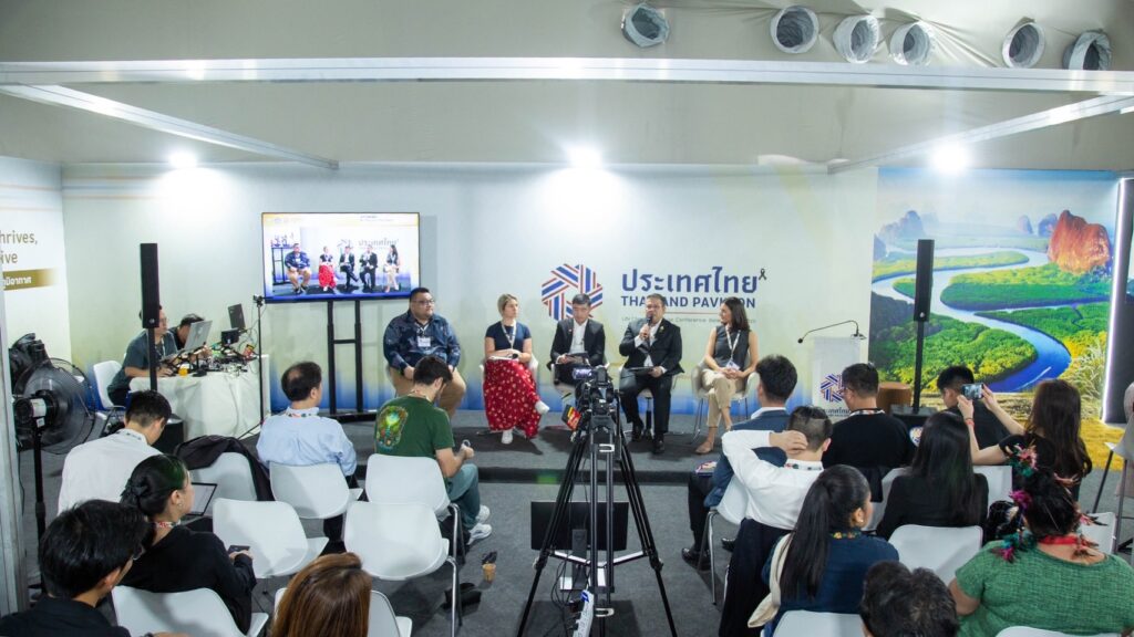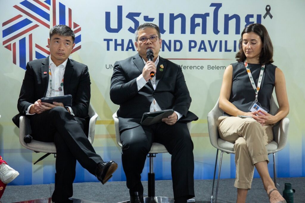 นอกจากนี้ ยังได้เยี่ยมชม Thailand Pavillion รับฟังการนำเสนอข้อมูลการมีส่วนร่วมที่ประเทศกำหนดด้านการลดการปล่อยก๊าซเรือนกระจก ณ ปี ค.ศ. 2035 หรือ NDC 3.0 รวมถึงข้อมูลการลงทุนและแผนธุรกิจในการพัฒนานวัตกรรมการลดก๊าซเรือนกระจกของ ปตท. และการไฟฟ้าฝ่ายผลิต ใน Innovation Zone พร้อมพูดคุยกับผู้แทนเยาวชนไทยในการสร้างแรงขับเคลื่อนสังคมให้แก้ไขปัญหาสภาพภูมิอากาศและสร้างภูมิคุ้มกัน นำไปสู่การพัฒนาคุณภาพชีวิตในสถานการณ์ภูมิอากาศโลกที่มีความรุนแรงมากยิ่งขึ้น อีกทั้ง Thailand Pavilion ยังมีเวทีเสวนาหลากหลายประเด็น โดยนายปวิช เกศววงศ์ รองอธิบดีกรมการเปลี่ยนแปลงสภาพภูมิอากาศและสิ่งแวดล้อม และผู้ทรงคุณวุฒิที่หลากหลายสาขา ร่วมเสวนาแสดงถึงความสำคัญของป่าไม้เขตร้อนที่สำคัญต่อการบรรเทาและบรรลุเป้าหมายการปรับตัว ความมั่นคงทางน้ำที่สำคัญอย่างยิ่งต่อมวลมนุษยชาติ ระบบตลาดคาร์บอนในภูมิภาคอาเซียน ยึดหลักความโปร่งใสและความน่าเชื่อถือสูง เชื่อมโยงกับตลาดคาร์บอนระดับโลก ปิดท้ายด้วยการเข้าถึงแหล่งเงินทุนอย่างเป็นธรรมตัวช่วยสำคัญในการขับเคลื่อนนโยบายจากคำมั่นสัญญาสู่การลงมือปฏิบัติจริง
