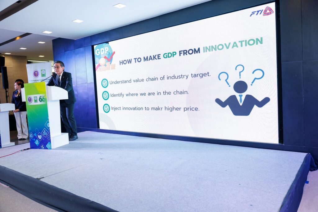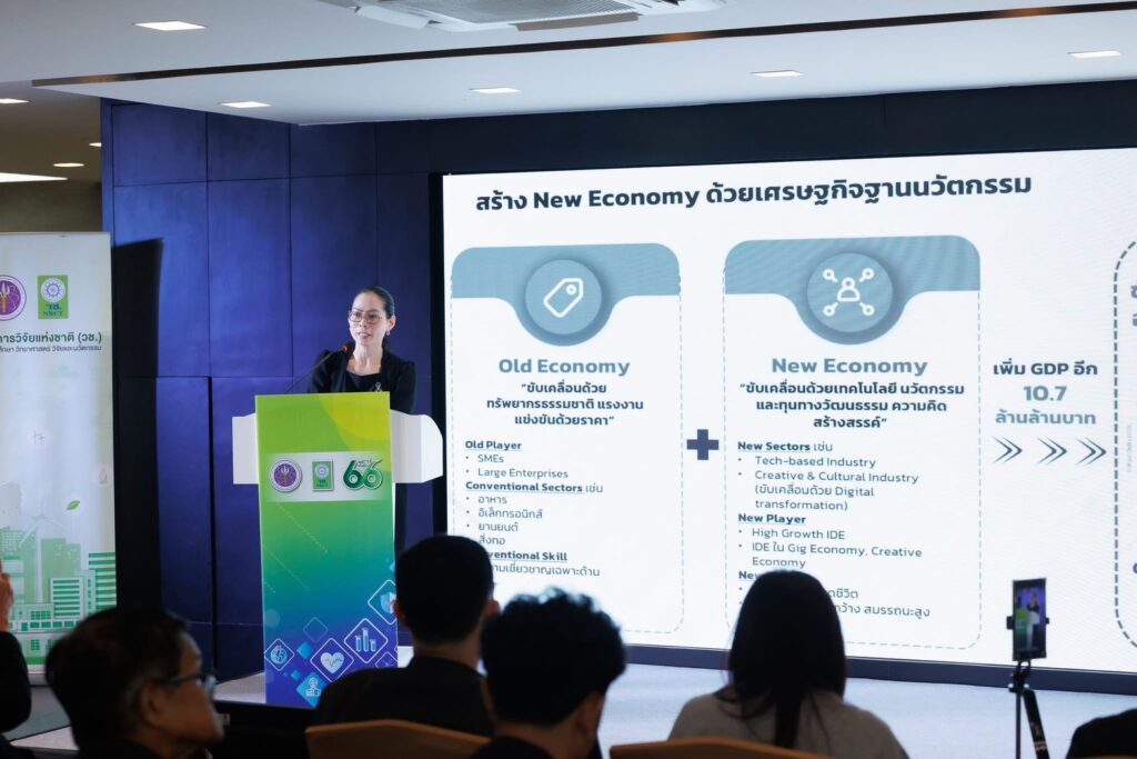 นอกจากนี้ ยังมีการเสวนานโยบายการลงทุนวิจัย เพื่อขับเคลื่อนอนาคตไทยสู่เศรษฐกิจฐานนวัตกรรม โดย ดร.สิริพร พิทยโสภณ รองผู้อำนวยการสำนักงานสภานโยบายการอุดมศึกษา วิทยาศาสตร์ วิจัยและนวัตกรรมแห่งชาติ ได้กล่าวถึง นโยบายการขับเคลื่อนประเทศสู่เศรษฐกิจฐานนวัตกรรม (Innovation-Driven Economy) โดยมีเป้าหมายคือยกระดับการพัฒนาประเทศ สร้างผู้ประกอบการฐานนวัตกรรม (IDE) และเพิ่มงบวิจัย (GERD) ผ่านมาตรการสนับสนุนและสิทธิประโยชน์ทางภาษี รศ.ดร.นพพร ลีปรีชานนท์ รองผู้อำนวยการสำนักงานคณะกรรมการส่งเสริมวิทยาศาสตร์วิจัยและนวัตกรรม กล่าวถึง แนวทางการลงทุนวิจัยและนวัตกรรมเพื่อสร้างความเข้มแข็งและยั่งยืน โดยเน้นผลักดันผลงานวิจัยสู่ SME/STARTUP/SPIN-OFF การสร้างระบบระบบนิเวศนวัตกรรม เปลี่ยนผ่านจากการให้ทุนสู่การร่วมลงทุน ผ่านมาตรการ/กลไกสำคัญ อาทิ TRIUP การจัดตั้ง University Holding Company (UHC) ให้สถาบันอุดมศึกษาสามารถนำผลงานวิจัยไปร่วมลงทุนและใช้ประโยชน์เชิงพาณิชย์ได้อย่างมีประสิทธิภาพ และ ดร.วิบูลย์ รักสาสน์เจริญผล รองเลขาธิการสภาอุตสาหกรรมแห่งประเทศไทย กล่าวถึง ความเชื่อมโยงระหว่างนวัตกรรมกับ GDP โดยเน้นย้ำความสำคัญของการยกระดับเทคโนโลยีจากระดับ “Incremental” เป็น “Disruptive” และกลยุทธ์การฉีดนวัตกรรมเข้าไปในห่วงโซ่คุณค่า (Value Chain) เพื่อสร้างผลิตภัณฑ์ที่มีมูลค่าและราคาสูงขึ้น