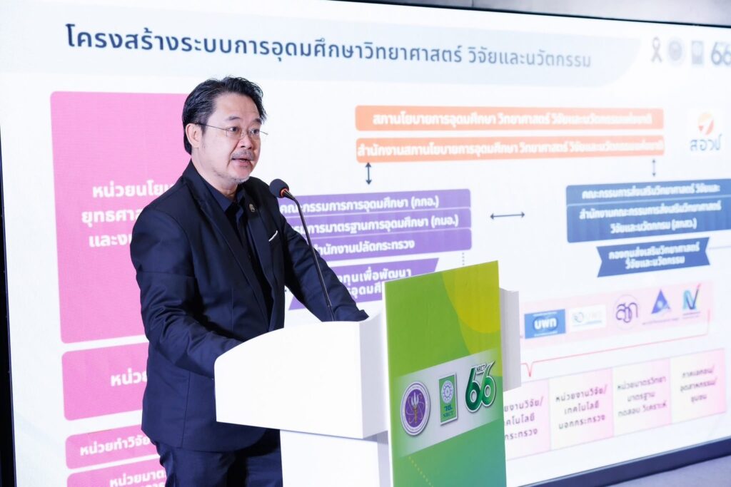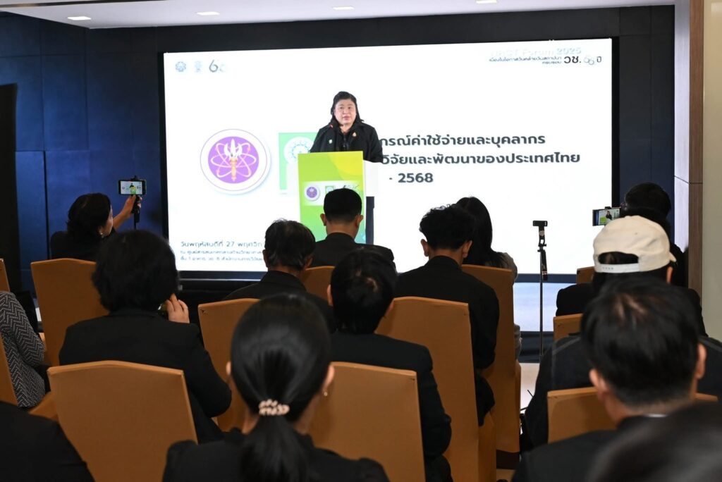 ดร.วิภารัตน์ ดีอ่อง ผู้อำนวยการสำนักงานการวิจัยแห่งชาติ กล่าวว่า วช. แถลงผลพยากรณ์ค่าใช้จ่ายและบุคลากรด้านการวิจัยและพัฒนา (R&D) ปี 2567–2568 เป็นตัวชี้วัดสำคัญใช้วัดขีดความสามารถด้านโครงสร้างพื้นฐานทางวิทยาศาสตร์ของสถาบัน IMD โดยปี 2567 ประเทศไทยมีค่าใช้จ่าย R&D (GERD) 172,263 ล้านบาท เติบโตเพิ่มขึ้นร้อยละ 2.47 GERD/GDP ร้อยละ 0.93 ปี 2568 ค่าใช้จ่าย 174,158 ล้านบาท เติบโตร้อยละ 1.10 GERD/GDP ร้อยละ 0.92 ปัจจัยที่ส่งผลต่อค่าใช้จ่ายสำคัญคือบุคลากรวิจัยและ GDP ปี 2567 บุคลากรเพิ่มร้อยละ 8.42 ปี 2568 ลดไม่มากร้อยละ 0.66 คาดว่าลดลงในกลุ่มเกษียณอายุ ส่งผลให้ค่าใช้จ่ายยังเพิ่มขึ้น ค่าใช้จ่าย R&D ส่วนใหญ่ในภาคเอกชนร้อยละ 66 ภาคการผลิตยังคงอยู่ในสัดส่วนสูงสุด (ร้อยละ 48) ถัดมาภาคบริการ (ร้อยละ 35) และค้าส่งค้าปลีก (ร้อยละ 17) SMEs มีแนวโน้มลงทุนวิจัยเพิ่มและมีความต้องการมาตรการสนับสนุนจากรัฐ การเข้าถึงมาตรการรัฐที่สะดวกไม่ซับซ้อน การผลิตเน้นลงทุนในสาขาอาหาร เคมีภัณฑ์ ผลิตภัณฑ์การกลั่นปิโตรเลียม อุปกรณ์ไฟฟ้า คอมพิวเตอร์อิเล็กทรอนิกส์ ภาคบริการเน้นการเงิน การบริหาร และสุขภาพ ค่าใช้จ่ายภาครัฐเพิ่มตาม GDP ปี 2567 ร้อยละ 4.42 ปี 2568 ร้อยละ 2.21 งานวิจัยภาครัฐเน้นด้านการแพทย์และสุขภาพ การบริการและท่องเที่ยวเชิงสร้างสรรค์ ด้านไฟฟ้าและอิเล็กทรอนิกส์ หุ่นยนต์และระบบอัตโนมัติ การพัฒนหลักสูตรนวัตกรรมการเรียนรู้ การผลิตและแปรรูปเกษตร อาหาร การบริหารจัดการน้ำ การจัดการฝุ่น PM 2.5 ส่วนบุคลากร R&D รายหัว ปี 2567 มี 239,202 คน เพิ่มจากปีก่อนร้อยละ 8.42 ปี 2568 ลดเหลือ 237,615 คน นักวิจัยส่วนใหญ่ร้อยละ 87 อายุ 25 – 54 ปี โดย อว. มีนโยบายสนับสนุนการผลิตบุคลากรวิจัยให้ตอบโจทย์ และ วช.ให้ควความสำคัญการพัฒนาเส้นทางอาชีพนักวิจัยและนวัตกรรมให้บรรลุเป้าหมาย 10,800 คน ปี 2566–2570 สนับสนุนขีดความสามารถแข่งขันและเศรษฐกิจ สังคม สิ่งแวดล้อม