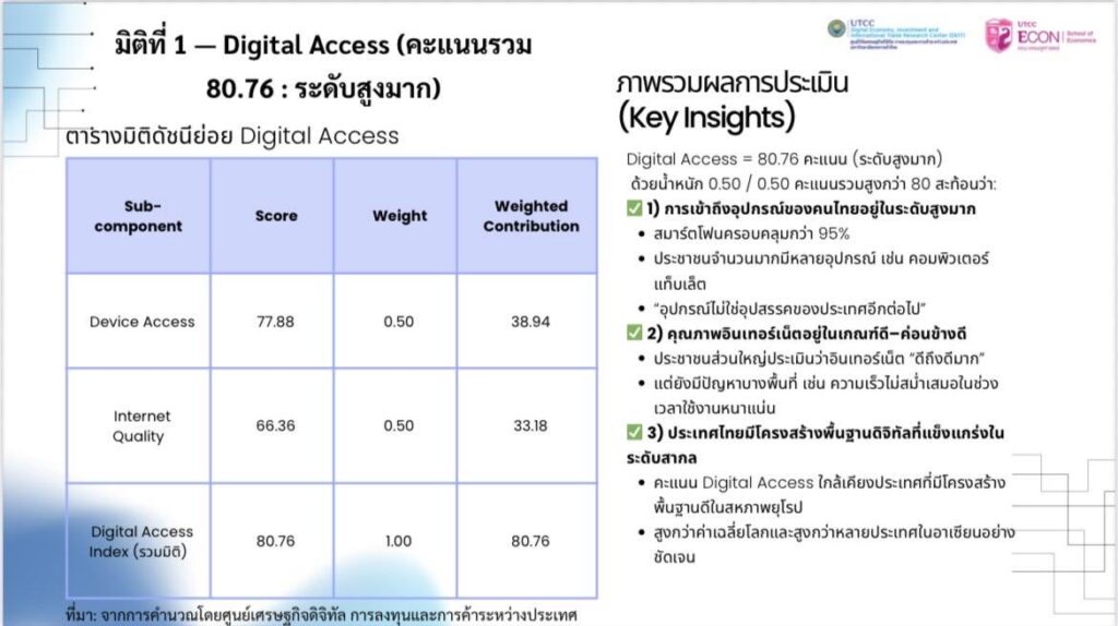 ผลการสำรวจเผยให้เห็นภาพความขัดแย้งที่น่าสนใจ ไทยได้คะแนนด้านการเข้าถึงเทคโนโลยี (Digital Access) สูงถึง 80.76 คะแนน ซึ่งใกล้เคียงกับค่าเฉลี่ยของประเทศชั้นนำในสหภาพยุโรปที่ 80-90 คะแนน และสูงกว่าค่าเฉลี่ยโลกที่ 70 คะแนน รวมทั้งสูงกว่าประเทศอาเซียนขนาดใหญ่ทุกประเทศ ไม่ว่าจะเป็นมาเลเซีย (74.8) เวียดนาม (66.9) และอินโดนีเซีย (60.3)