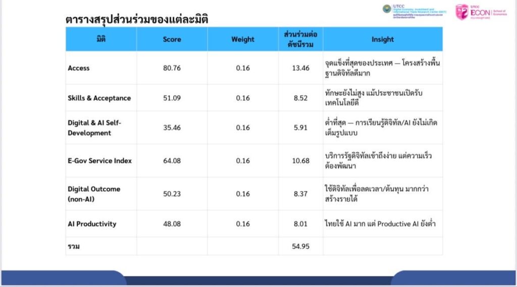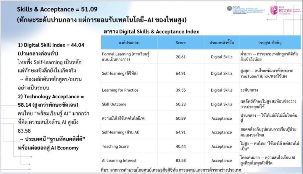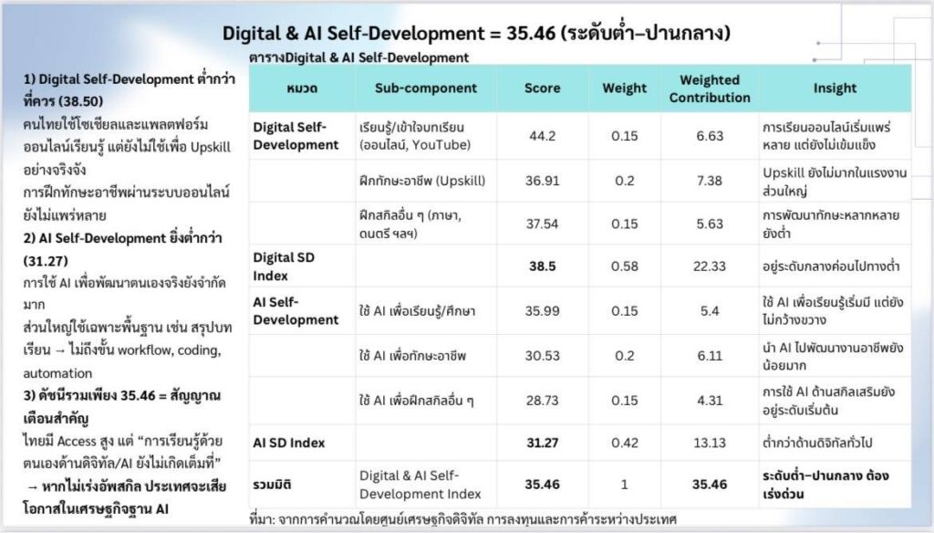 ในทางตรงกันข้าม คะแนนด้านทักษะดิจิทัล (Digital Skills) อยู่ที่เพียง 44.04 คะแนน ซึ่งอยู่ในระดับ “ปานกลางค่อนต่ำ” เมื่อเทียบกับมาตรฐานสากล ขณะที่การพัฒนาตนเองด้านดิจิทัลและ AI มีคะแนนเพียง 35.46 ซึ่งถือว่าต่ำมาก