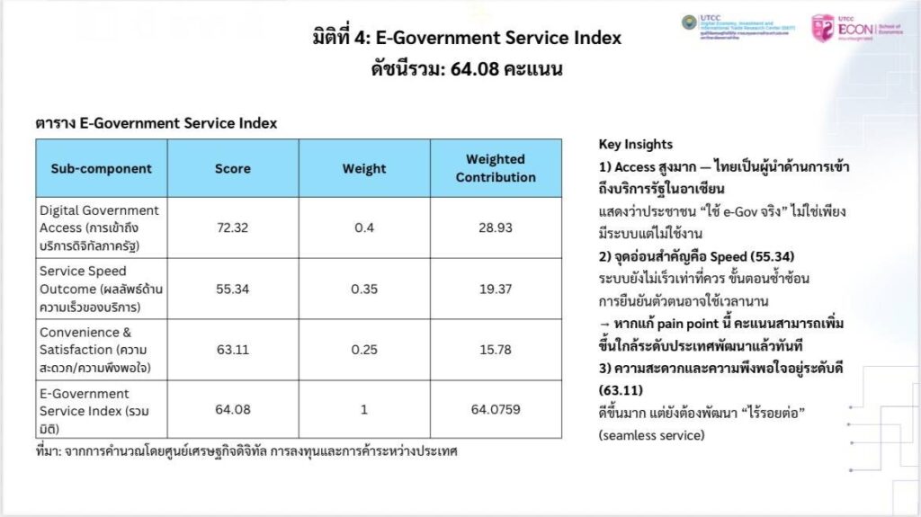 ด้านการใช้บริการภาครัฐดิจิทัล (E-Government Services) ได้คะแนน 64.08 ซึ่งถือว่าดี โดยประชาชนให้คะแนนด้านการเข้าถึงสูง แต่ยังมีข้อจำกัดเรื่องความเร็วของการให้บริการที่ยังไม่ seamless เท่าที่ควร