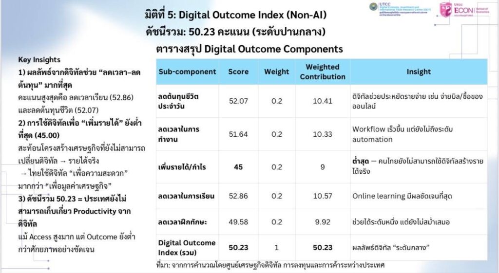 กรุงเทพฯ – ศูนย์วิจัยเศรษฐกิจดิจิทัล การลงทุนและการค้าระหว่างประเทศ (DEIIT) คณะเศรษฐศาสตร์ มหาวิทยาลัยหอการค้าไทย เปิดเผยผลสำรวจ “ดัชนีการเปลี่ยนผ่านดิจิทัลของประเทศไทย” (Thailand Digital Transformation Index: TDTI) ครั้งแรก พบว่าประเทศไทยมีโครงสร้างพื้นฐานดิจิทัลและการเข้าถึงเทคโนโลยีอยู่ในระดับสูงที่สุดในอาเซียน เทียบเท่าประเทศชั้นนำของสหภาพยุโรป แต่ยังมีช่องว่างด้านทักษะดิจิทัลและความสามารถในการใช้ AI เพื่อสร้างผลิตภาพที่ต่ำกว่าค่าเฉลี่ยสากลอย่างมีนัยสำคัญ