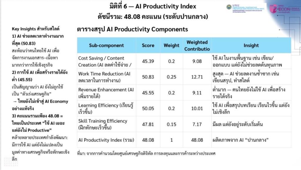 ด้านผลิตภาพจากการใช้ AI (AI Productivity) ได้คะแนน 48.08 ซึ่งอยู่ในระดับปานกลาง โดยประชาชนรับรู้ว่า AI ช่วยลดเวลาการทำงานได้มาก (50.83 คะแนน) แต่กลับช่วยเพิ่มรายได้ได้น้อยที่สุด (45.55 คะแนน) สะท้อนให้เห็นว่าคนไทยใช้ AI เพื่อความสะดวกมากกว่าการสร้างมูลค่าเชิงเศรษฐกิจ