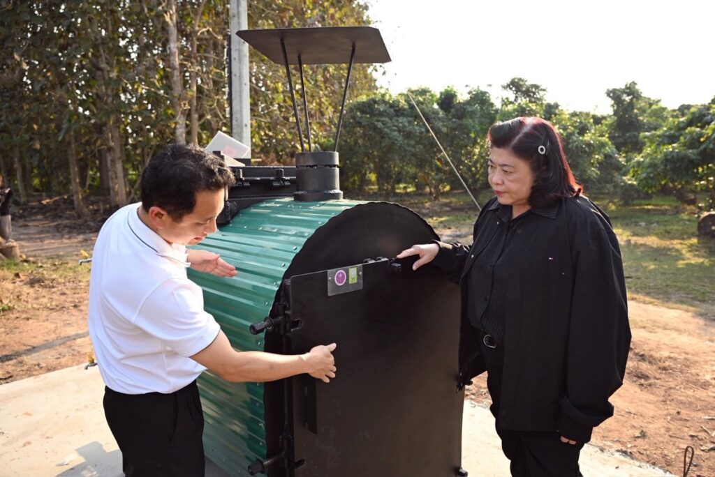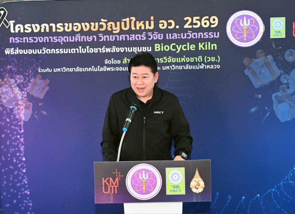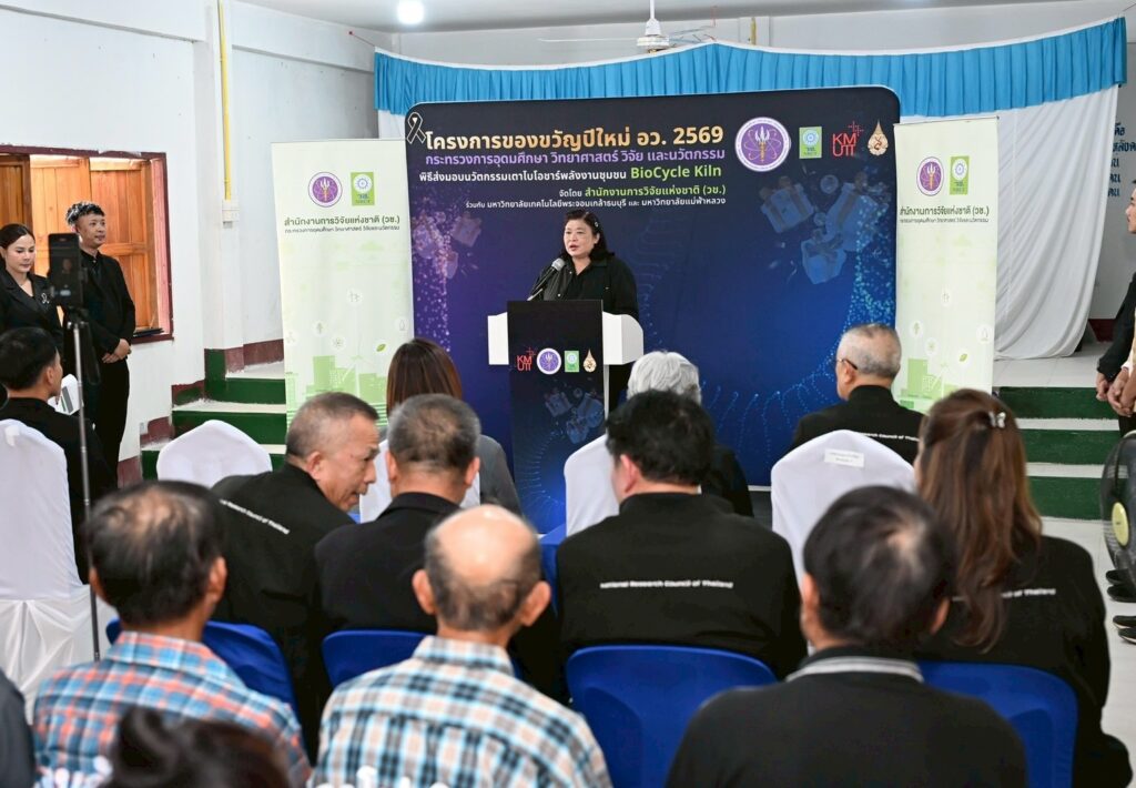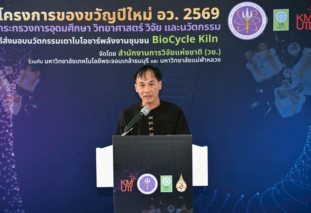 ดร.วิภารัตน์ ดีอ่อง ผู้อำนวยการสำนักงานการวิจัยแห่งชาติ กล่าวว่า อว.ได้จัดทำโครงการของขวัญปีใหม่ 2569 ซึ่ง วช.ได้ร่วมมอบนวัตกรรมเพื่อการใช้ประโยชน์ให้กับพื้นที่ ผ่านนวัตกรรมเตาไบโอชาร์พลังงานชุมชน BioCycle Kiln โดยสนับสนุนให้มหาวิทยาลัยเทคโนโลยีพระจอมเกล้าธนบุรีร่วมกับมหาวิทยาลัยแม่ฟ้าหลวง ร่วมพัฒนานวัตกรรมดังกล่าว ควบคู่ไปกับการถ่ายทอดองค์ความรู้ด้านการใช้งานสู่ชุมชน เพื่อให้สามารถนำเทคโนโลยีไปประยุกต์ใช้ในการจัดการเศษวัสดุเหลือทิ้งทางการเกษตรได้อย่างมีประสิทธิภาพ ส่งเสริมให้ชุมชนสามารถพึ่งพาตนเองด้านเทคโนโลยี ต่อยอดการใช้ประโยชน์เชิงเศรษฐกิจและสิ่งแวดล้อม อันจะนำไปสู่การพัฒนาคุณภาพชีวิตของประชาชนและความเข้มแข็งของชุมชน