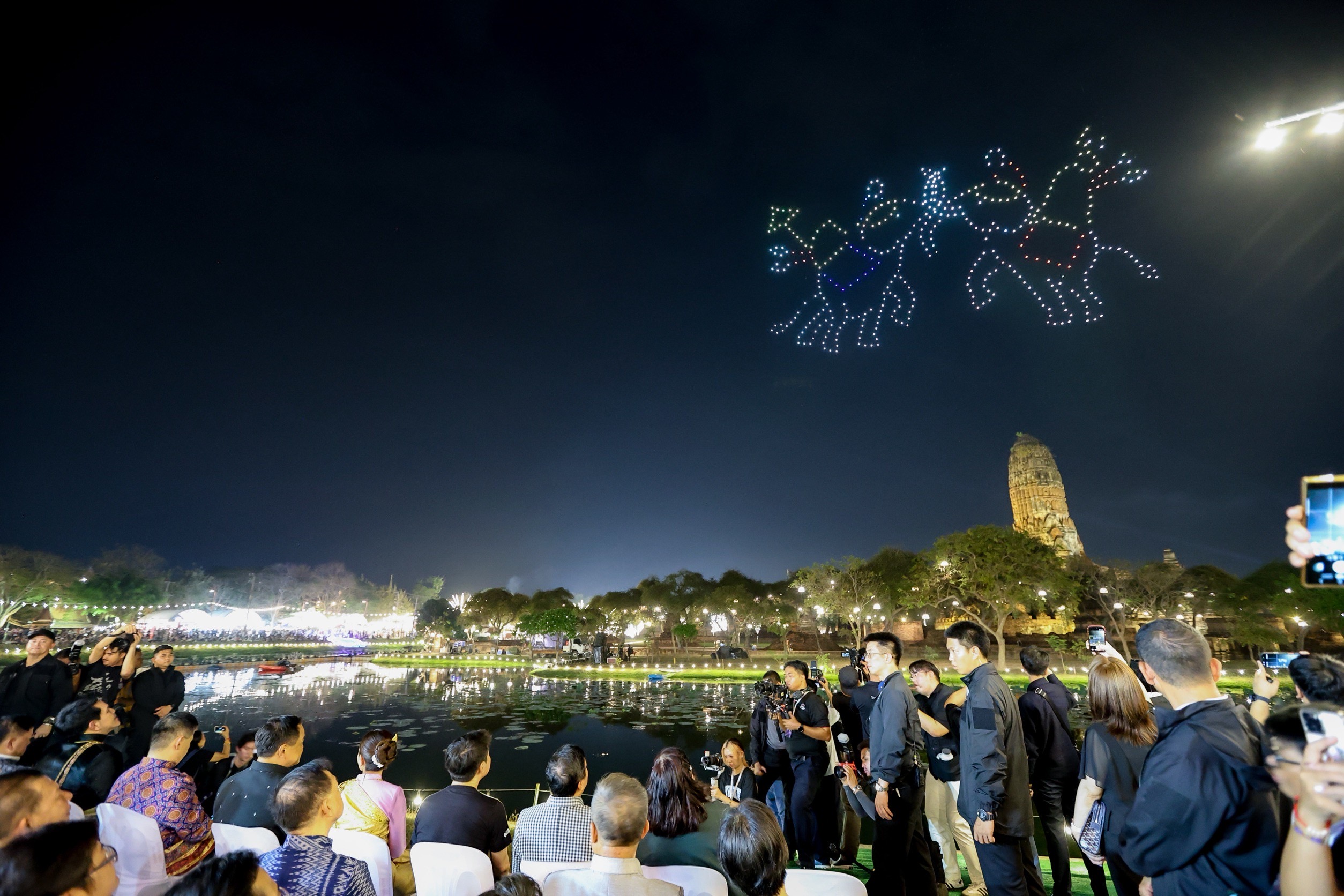ในการแสดงบินโดรนครั้งนี้ประกอบด้วย ภาพธงชาติไทย ภาพสมเด็จพระนเรศวรมหาราช ภาพสงครามยุทธหัตถี ภาพพระบาทสมเด็จพระเจ้าอยู่หัวและสมเด็จพระนางเจ้าฯพระบรมราชินี ภาพตราสัญลักษณ์ประจําจังหวัดพระนครศรีอยุธยา ภาพวัดพระศรีสรรเพชญ์ ภาพเศียรพระพุทธรูปในรากต้นโพธิ์”วัดมหาธาตุ” ภาพวัดไชยวัฒนารามภาพสัญลักษณ์งานยอยศยิ่งฟ้าอยุธยามรดกโลกภาพตราสัญลักษณ์กระทรวงการอุดมศึกษาวิทยาศาสตร์วิจัยและนวัตกรรม(อว.) ภาพตราสัญลักษณ์สำนักงานการวิจัยแห่งชาติ(วช.) โดยใช้โดรนแปรอักษรจำนวน500 ลำ เป็นการนำเสนอเทคโนโลยีและนวัตกรรมที่ทันสมัยเป็นสัญลักษณ์ของความก้าวหน้าและการพัฒนาในด้านวิทยาศาสตร์และนวัตกรรมที่ประเทศไทยได้มุ่งมั่นดำเนินการมาอย่างต่อเนื่องให้เป็นที่รู้จักในสายตาของผู้คนทั้งในและต่างประเทศโดยเฉพาะเมื่อกิจกรรมครั้งนี้ได้จัดร่วมกับ”งานยอยศยิ่งฟ้าอยุธยามรดกโลก” ซึ่งเป็นการผสมผสานระหว่างเทคโนโลยีและประเพณีอันทรงคุณค่าของไทยได้อย่างลงตัวสร้างประสบการณ์ที่น่าประทับใจความสำเร็จของโครงการในการจัดแสดงครั้งนี้จะไม่เป็นเพียงการกระตุ้นส่งเสริมการท่องเที่ยวของจังหวัดพระนครศรีอยุธยาแต่ยังเป็นแรงบันดาลใจให้กับคนไทยในการใช้เทคโนโลยีเพื่อสร้างสรรค์สิ่งใหม่ๆที่มีคุณค่าแก่สังคม