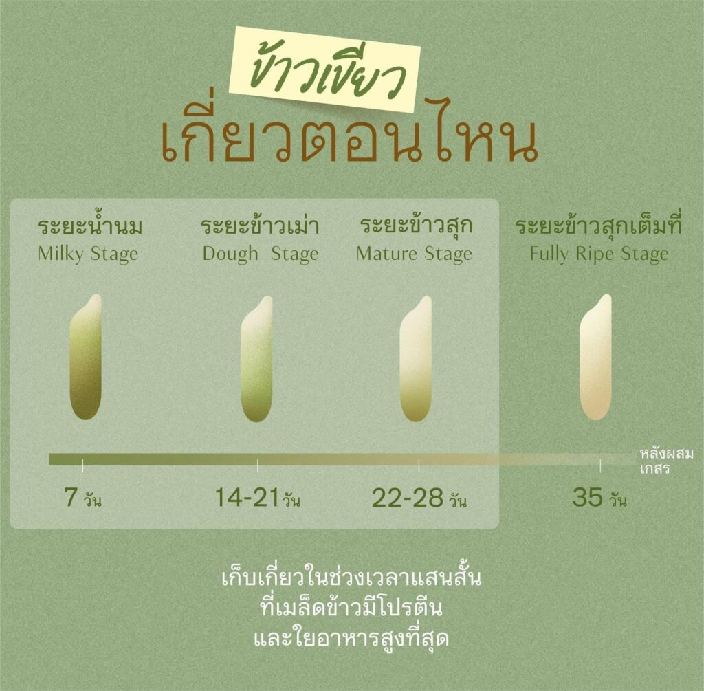 โดยทั่วไป เกษตรกรมักรอให้เมล็ดข้าวเจริญเติบโตเต็มที่จนมีลักษณะสุกแก่สีทอง ก่อนนำไปแปรรูปเป็นข้าวสารเพื่อจำหน่าย แต่กลุ่มเกษตรกรบ้านทิพย์ช้างได้เลือกแนวทางที่แตกต่าง ด้วยการเก็บเกี่ยวผลผลิตในช่วง “ระยะน้ำนม” (Milk Stage) ซึ่งเป็นช่วงเวลาสั้น ๆ ประมาณ 7 – 10 วัน ภายหลังการออกดอก ในระยะดังกล่าว เมล็ดข้าวอยู่ในช่วงที่มีการสะสมสารอาหารอย่างเข้มข้น โดยมีวิตามินและสารอาหารที่จำเป็นต่อร่างกายในปริมาณสูงกว่าข้าวสารที่เก็บเกี่ยวในระยะสุกแก่ทั่วไป รายละเอียดตามภาพด้านล่าง