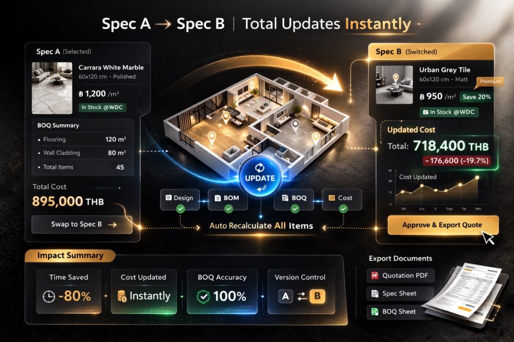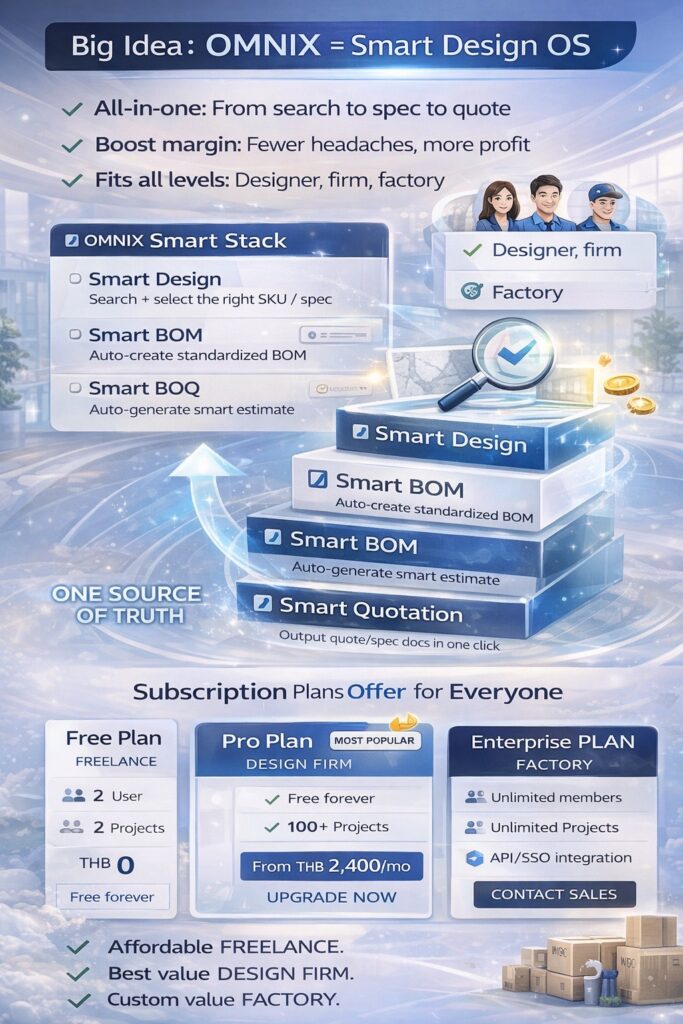 คุณภาณุเมศวร์ เศรษฐสิริสุนทร| Marketing, Branding & Product Consultant, OMNIX กล่าวว่า OMNIX ถูกออกแบบจากทีมผู้เชี่ยวชาญที่ “รู้ปัญหาในงานจริง” โดยมีเป้าหมายทำให้ทุกอย่างง่ายขึ้น เร็วขึ้น และแม่นยำมากขึ้น พร้อมยืนยันกำหนดการเปิดใช้งานจริงว่า “OMNIX ถูกพัฒนาโดยคนที่เข้าใจงานออกแบบจริง ๆ เราตั้งใจให้ workflow ของการสเปควัสดุ การทำ BOM/BOQ และการออกใบเสนอราคาเป็นมาตรฐานเดียวกัน เพื่อให้ทีมทำงานร่วมกันได้อย่างมีประสิทธิภาพ และวัดผลได้ชัดเจน โดยมีแผนเปิดใช้งานจริงใน เดือนพฤษภาคม2569 ในรูปแบบสมาชิก (Subscription)”