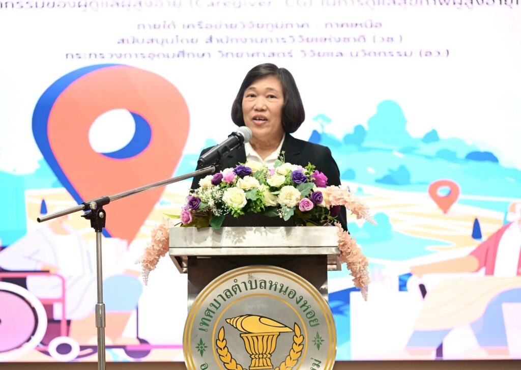นางดรุณี สามใบ ผู้แทน Care giver เทศบาลตำบลหนองหอย กล่าวขอบคุณ วช. คณะนักวิจัย และทุกภาคีเครือข่าย ที่ได้พัฒนาองค์ความรู้ เทคโนโลยี และนวัตกรรมเพื่อสนับสนุนการทำงานของผู้ดูแลผู้สูงอายุ การได้เรียนรู้และใช้เครื่องมือ เช่น แอปพลิเคชัน Caregiver 4.0 ช่วยให้การดูแลผู้สูงอายุมีความเป็นระบบ มั่นใจ และปลอดภัยมากยิ่งขึ้น และพร้อมที่จะนำความรู้ที่ได้รับไปพัฒนาการดูแลผู้สูงอายุในชุมชนให้ดียิ่งขึ้น เพื่อคุณภาพชีวิตที่ดีและยั่งยืนของผู้สูงอายุในชุมชน