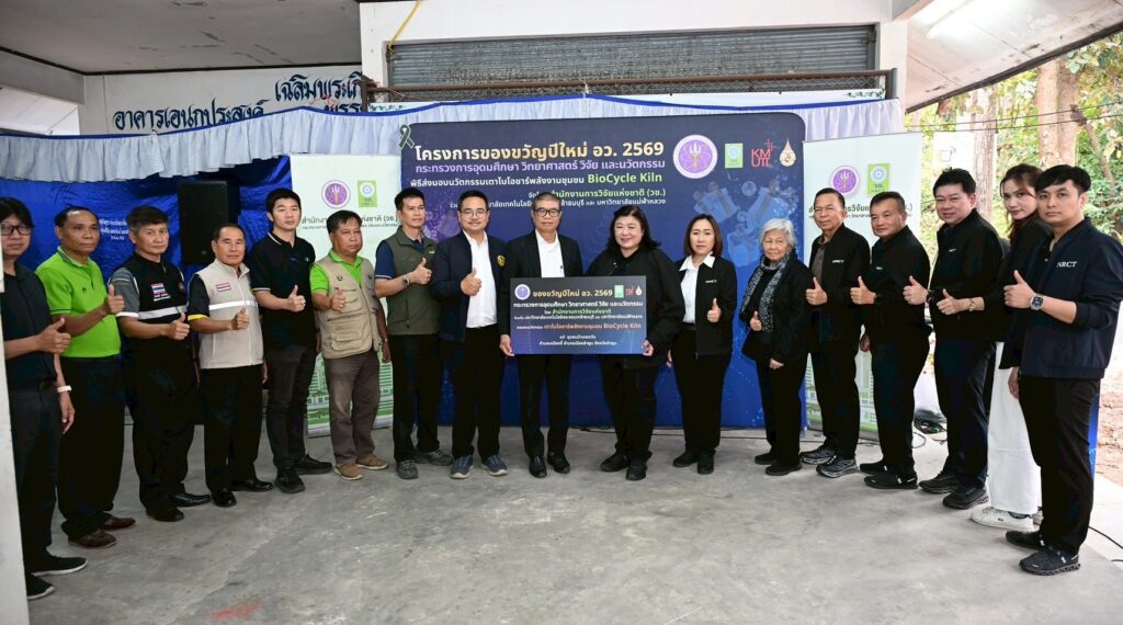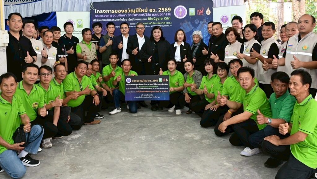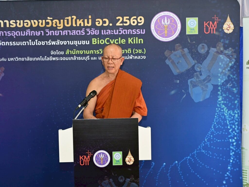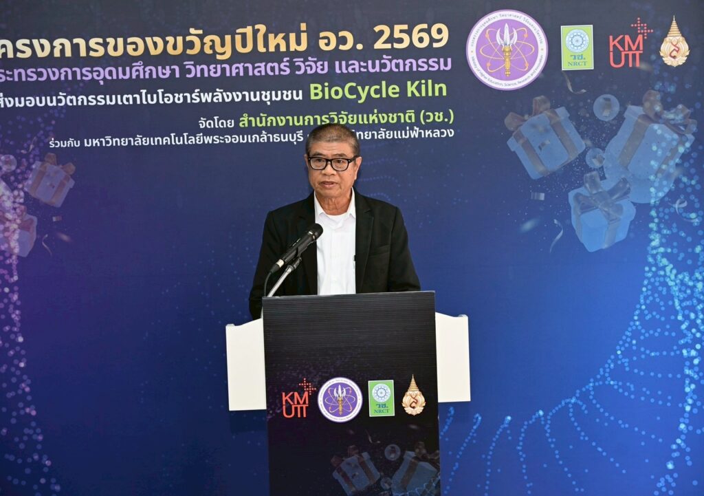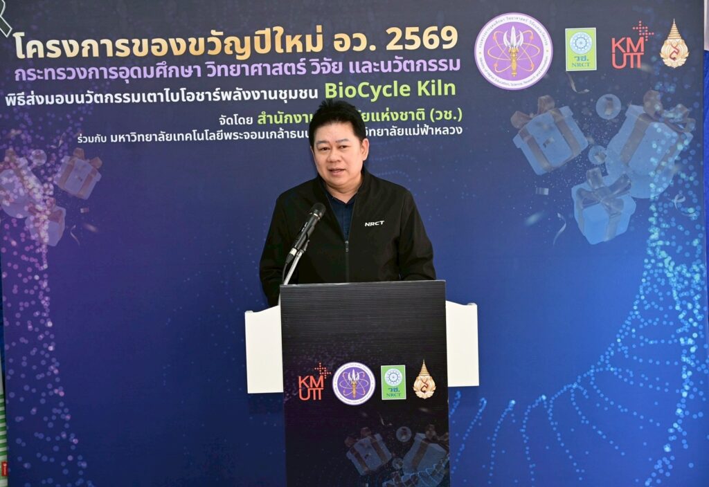 วันที่ 23 กุมภาพันธ์ 2569 สำนักงานการวิจัยแห่งชาติ(วช.) กระทรวงการอุดมศึกษา วิทยาศาสตร์ วิจัยและนวัตกรรม จัดพิธีส่งมอบนวัตกรรม “เตาไบโอชาร์พลังงานชุมชน BioCycle Kiln” ภายใต้โครงการของขวัญปีใหม่ อว. 2569 ให้แก่ชุมชนบ้านเชตะวัน เพื่อสนับสนุนการจัดการเศษวัสดุเหลือใช้ทางการเกษตรอย่างยั่งยืน โดยมี ดร.วิภารัตน์ ดีอ่อง ผู้อำนวยการสำนักงานการวิจัยแห่งชาติ เป็นประธานในพิธี พร้อมด้วย รองศาสตราจารย์ ดร.อนรรฆ ขันธะชวนะ หัวหน้าโครงการวิจัย กล่าวรายงาน พันตรีชนินทร พุฒิเศรษฐ์ นายกเทศมนตรีตำบลเหมืองจี้ กล่าวต้อนรับ ตลอดจน พระมหาวิธณัฐธนโชค ติกปัญโญ เจ้าอาวาสวัดเชตวันธรรมาราม นางสาวศิรินทร์พร เดียวตระกูล รองผู้อำนวยการสำนักงานการวิจัยแห่งชาติ และคณะผู้ทรงคุณวุฒิ วช. เข้าร่วมพิธี ณ ชุมชนบ้านเชตะวัน ตำบลเหมืองจี้ อำเภอเมือง จังหวัดลำพูน