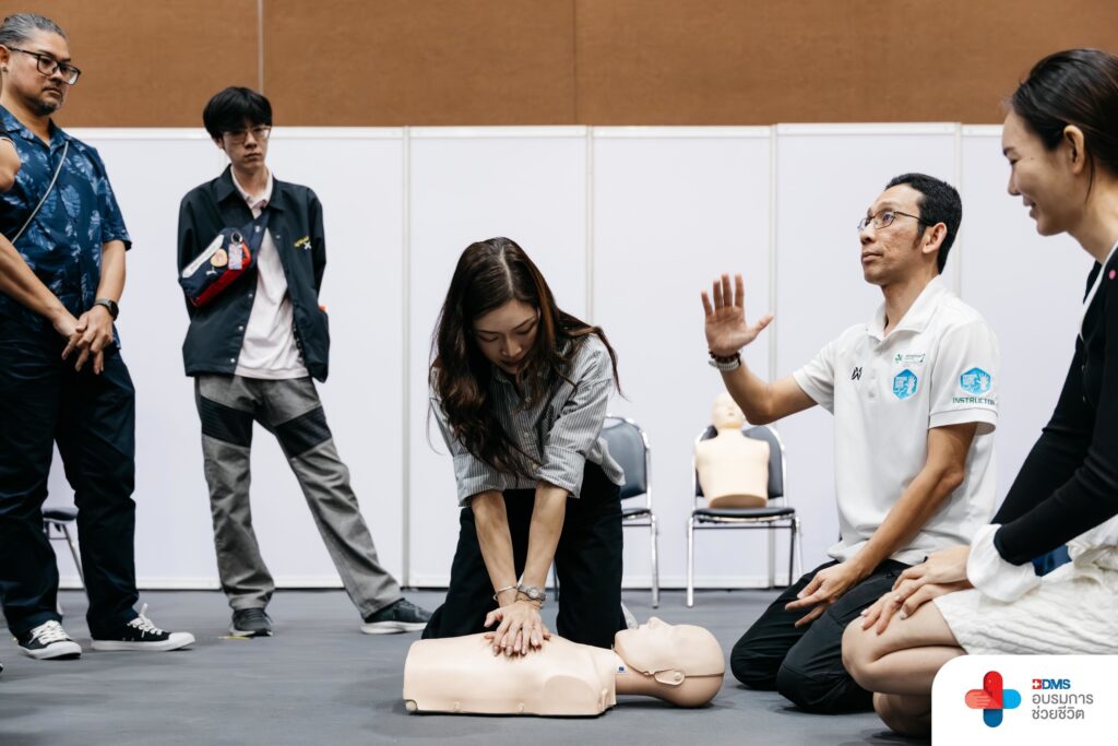 นอกจากการให้ความรู้ด้านโรคหัวใจแล้ว ภายในเวิร์กช็อปยังเปิดโอกาสให้ผู้เข้าร่วมได้ ฝึกปฏิบัติการช่วยชีวิตขั้นพื้นฐาน (CPR) และทดลองใช้ เครื่องกระตุกหัวใจไฟฟ้าอัตโนมัติ (AED) ผ่านสถานการณ์จำลอง โดยมีทีมแพทย์และเจ้าหน้าที่ให้คำแนะนำอย่างใกล้ชิด เพื่อเสริมทักษะการช่วยชีวิตในภาวะหัวใจหยุดเต้นฉุกเฉิน ซึ่งเป็นทักษะสำคัญที่ประชาชนทั่วไปสามารถนำไปใช้ได้จริงก่อนทีมแพทย์จะเดินทางมาถึง